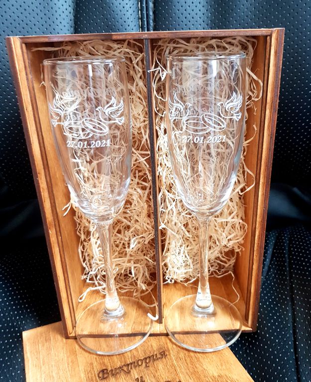 Свадебные фужеры с гравировкой в деревянном боксе
