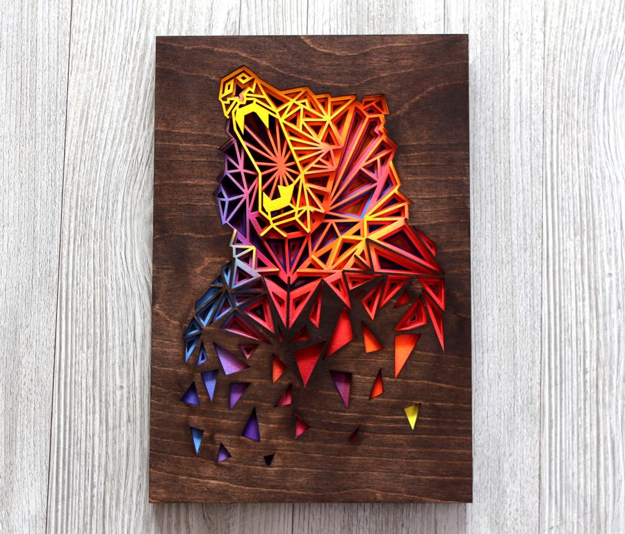 Объемное настенное панно "Медведь". Состоит из 6 слоев. Покрытие - тонирующее масло для дерева. Ширина 25 см, высота 37 см, толщина 2,4 см.