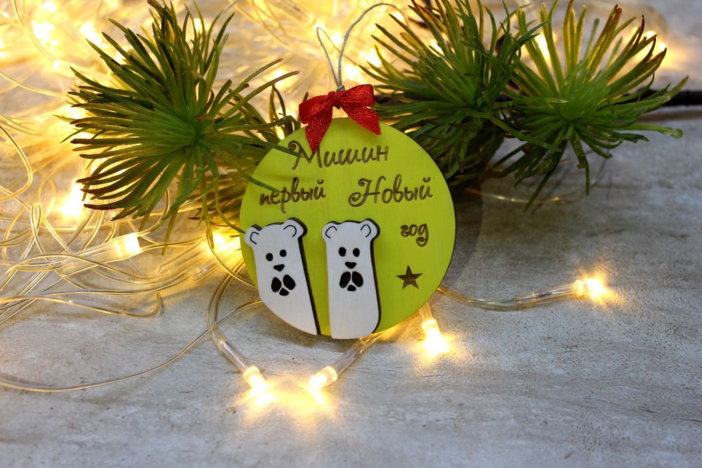 Игрушка на елку новогодняя. Основа игрушки из фанеры, с гравировкой. Медальон выполнен из акрила, так же с лазерной гравировкой. Форма и вид игрушек могут быть абсолютно любыми